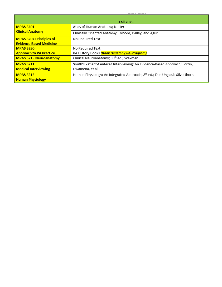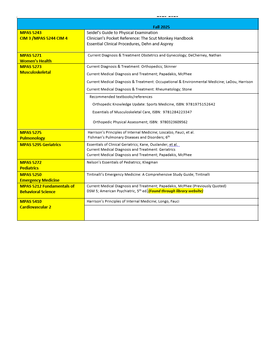 Students are required to use the MOST CURRENT EDITION of all textbooks. Most textbooks are available through the Gibson D. Lewis Library on the UNT Health campus through AccessMedicine.