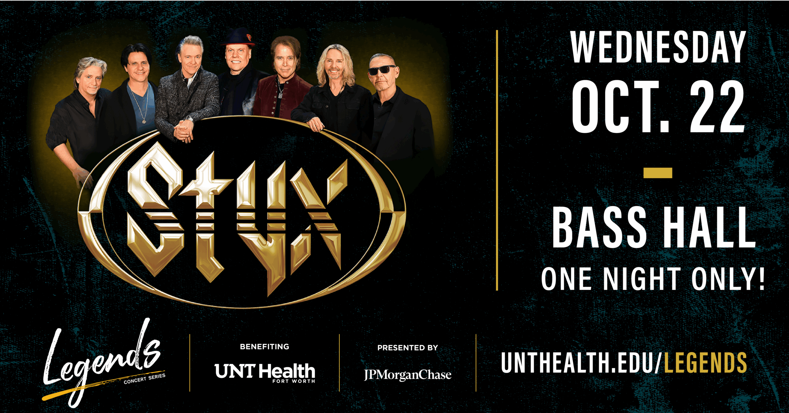 Rock band Styx will be the featured artist at the 2025 Legends Concert Series, UNT Health Fort Worth’s signature fundraising event. Premium seats in the orchestra pit, orchestra front and box tier are bundled in VIP packages and sold exclusively through UNT Health. Please see options below or contact Lee Ann Embry for more information. Email LeeAnn.Embry@unthealth.edu